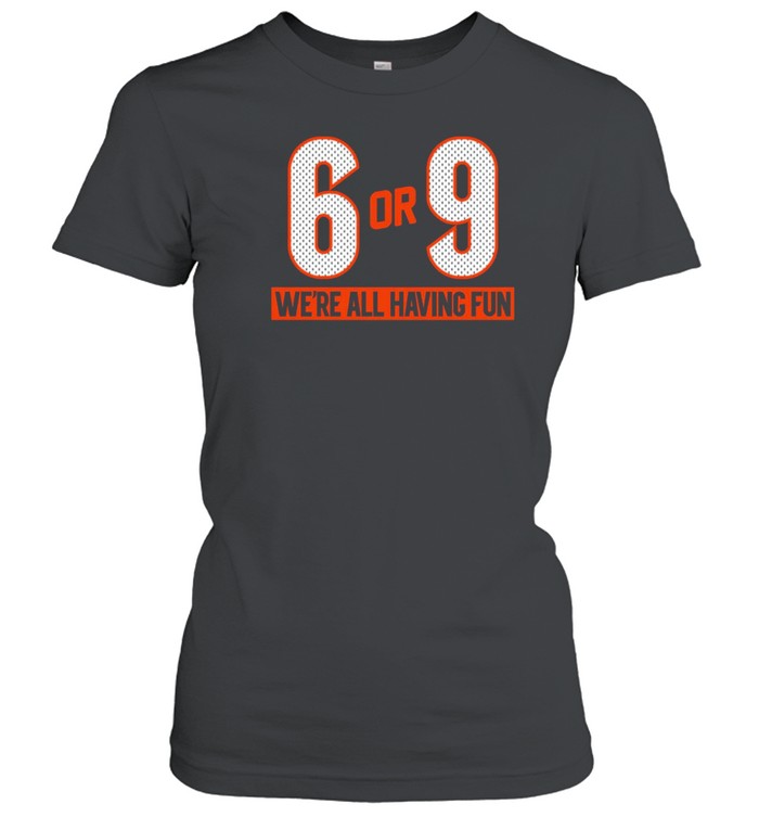 The Joe Burrow 6 Or 9 We Are All Having Fun Cincinnati Bengals Shirt has become more than just a piece of fan apparel—it’s a symbol of camaraderie, perseverance, and good-natured rivalry among Bengals supporters. From playful betting among friends to showcasing team pride at games, this shirt unites fans in both humor and loyalty. If you’re looking to amplify your Bengals fandom and enjoy some light-hearted fun, this shirt is a perfect addition to your sports wardrobe.